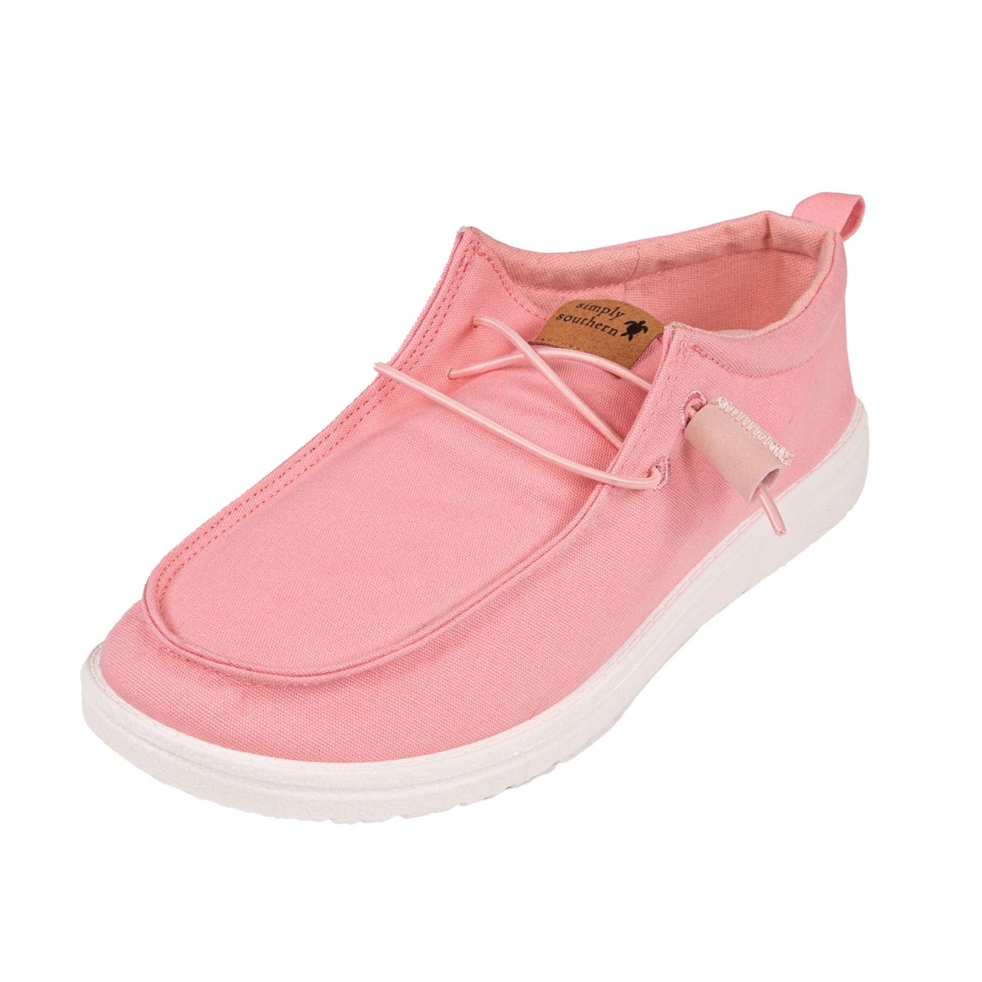 Comfortable lace up slip-on shoes with a rubber sole and a faux leather Simply Southern patch on the tongue. Made of polyester and PVC.