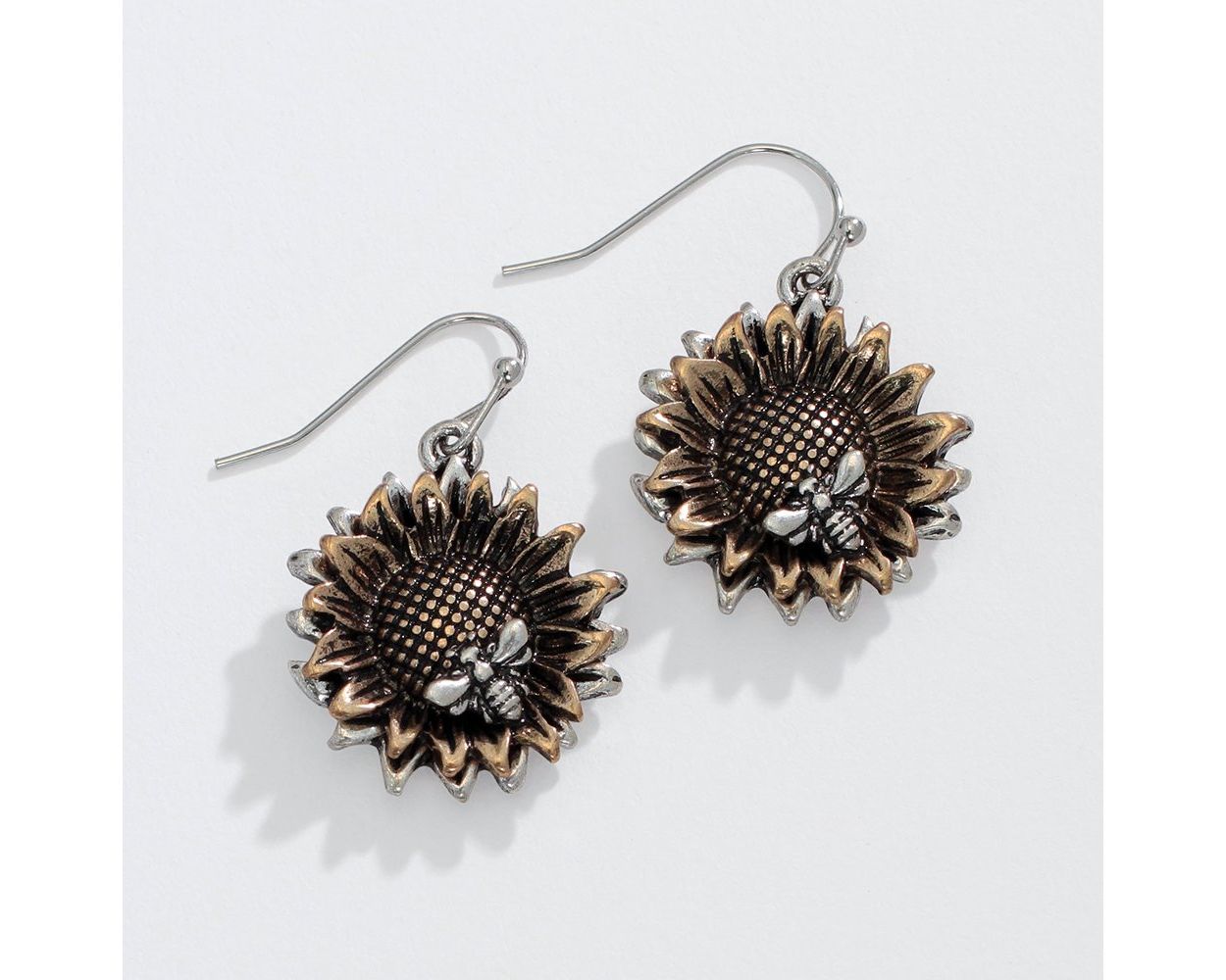 Add a buzzing touch to your outfit with these playful two-tone sunflower earrings featuring adorable bees. Embrace your whimsical side and make a statement with this unique accessory. (Bee-lieve us, you'll love them!)